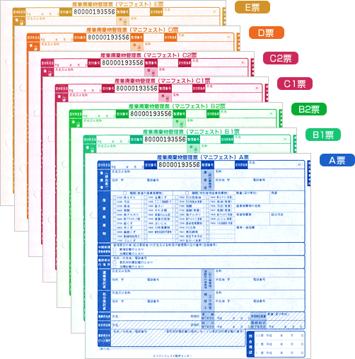 A票 排出事業者控え B1票 運搬業者控え B2票 運搬業者から排出事業者に返却 排出事業者控え ※運搬が終了した事を確認 C1票 処分業者控え C2票 処分業者から運搬業者に返却 運搬業者控え ※処分が終了した事を確認 D票 処分業者から排出事業者に返却 排出事業者控え ※処分が終了した事を確認 E票 処分業者から排出事業者に返却 排出事業者控え ※最終処分が終了した事を確認