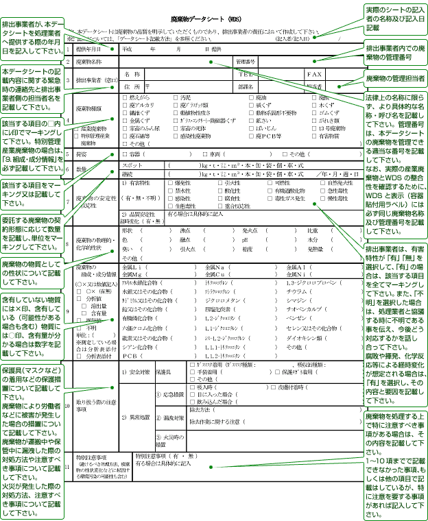 廃棄物の処理過程事故を未然に防ぎ環境に適応した処理を行えることを目的としています。排出事業者が伝えるべき産業廃棄物の情報項目について具体的に明示がされていて、排出事業者が処理業者へ産業廃棄物の処理を委託する際には、可能な限り詳細に記載する責任があります。廃棄物データシートの記載方法
